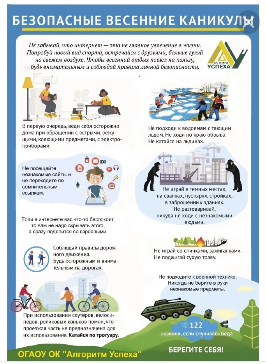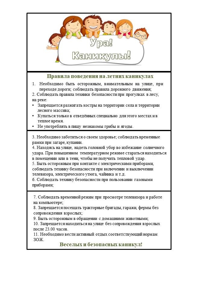 Проводите с детьми как можно больше времени во время каникул, а если ребенок все-таки остается дома один, то постарайтесь максимально занять его чем-то увлекательным на время вашего отсутствия. Во-первых, чтобы предотвратить опасную ситуацию, ребенок, оставшийся дома один, должен согласовывать свои действия с родителями по телефону. Во-вторых, нужно больше разговаривать со своими детьми, узнавать об их интересах и проблемах. Это поможет избежать проблем недопонимания, особенно если ребенок подросткового возраста. В-третьих, ребенка нужно воспитывать своим примером – это самый тактичный и незаметный способ воспитания.